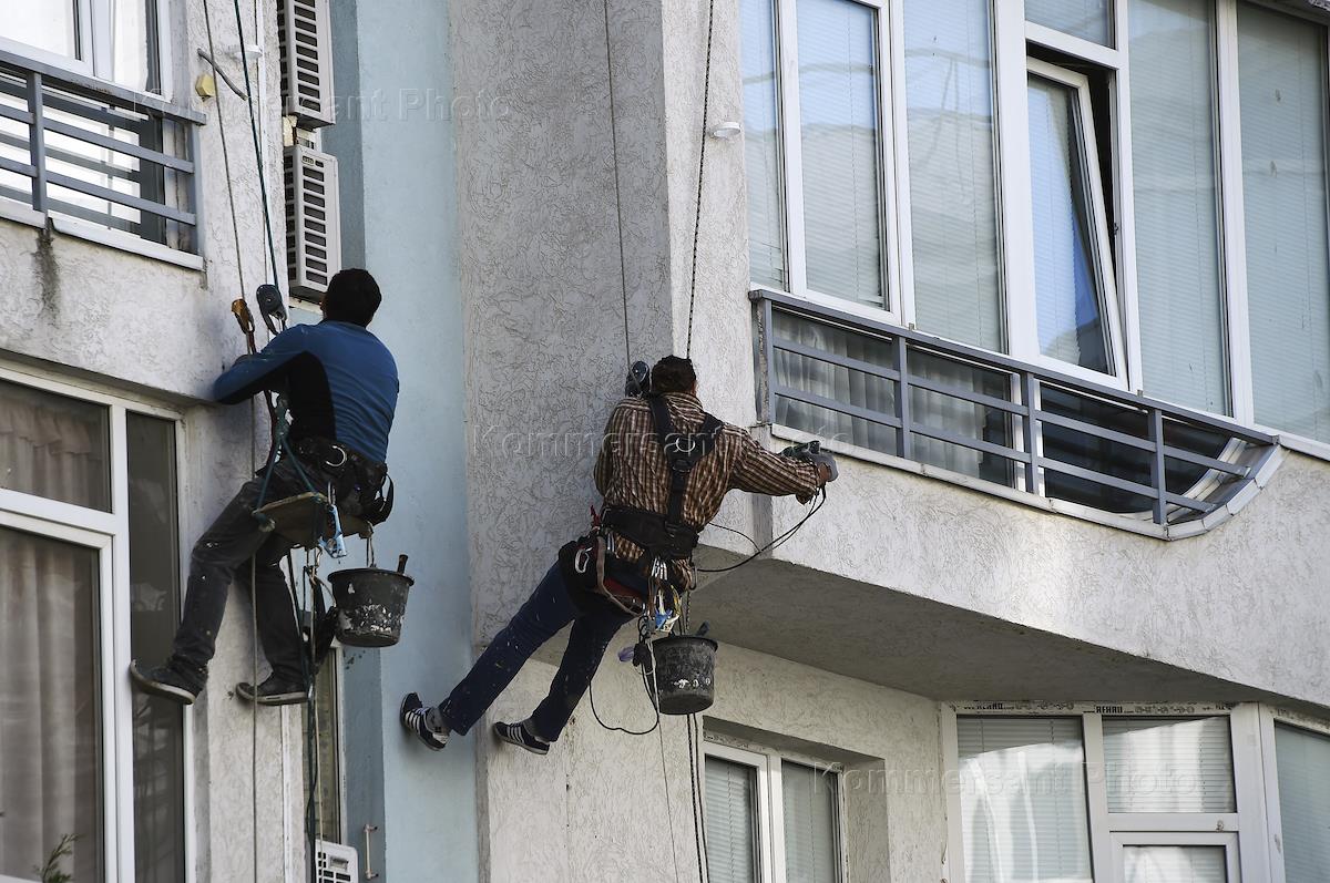 Жанровая фотография. Рабочие красят фасад жилого дома.