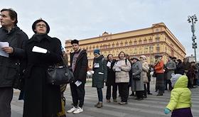 Акция "Возвращение имен" накануне Дня памяти жертв политических репрессий у Соловецкого камня на Лубянской площади.