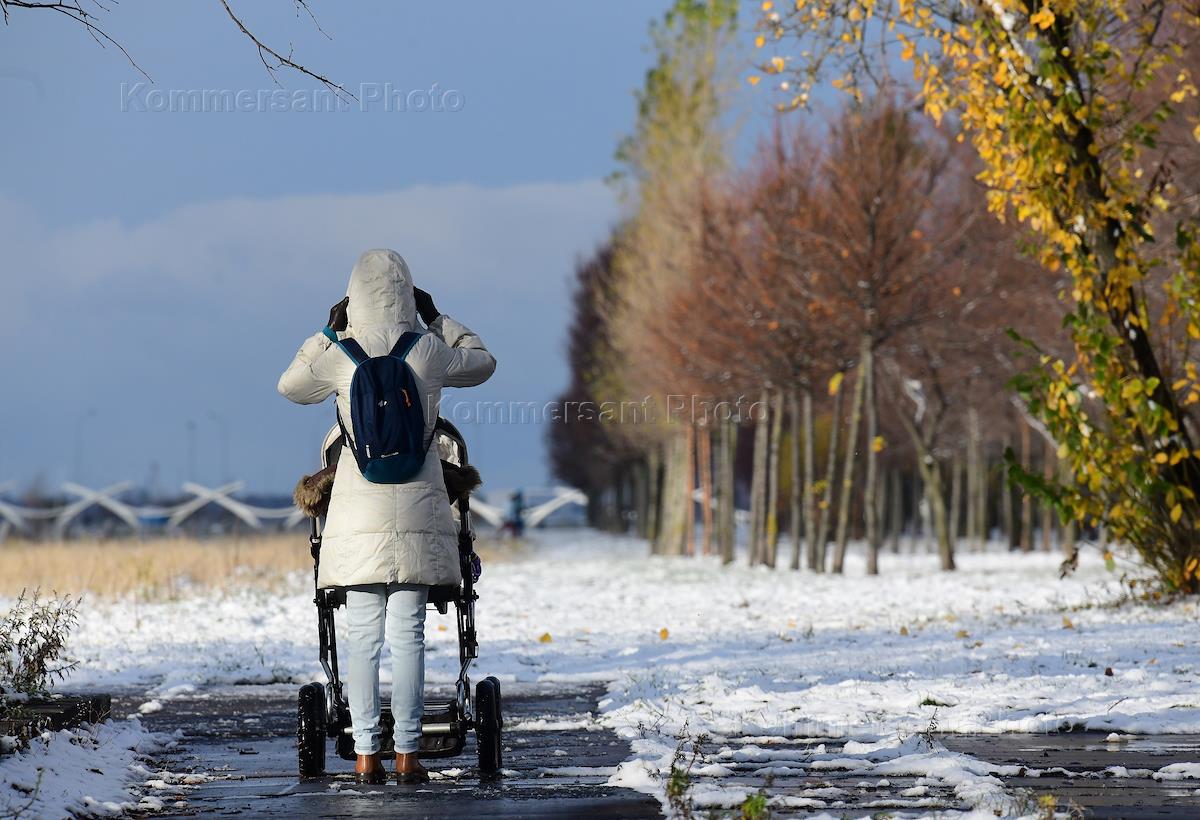 Жанровая фотография. Женщина с детской коляской на прогулке.