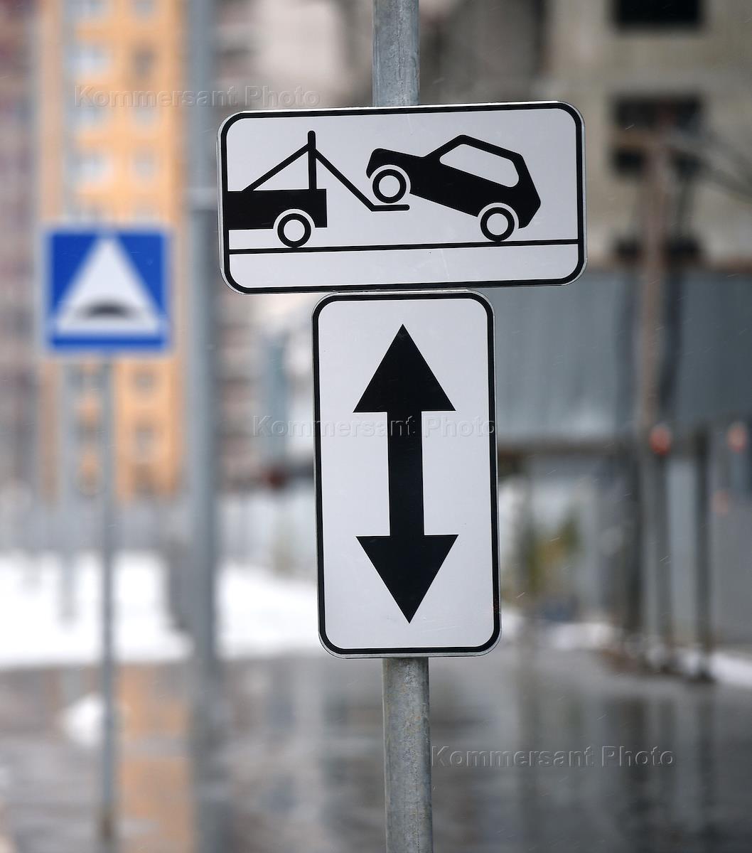 Жанровая фотография. Дорожный знак "Работает эвакуатор" для неправильно припаркованных автомобилей.