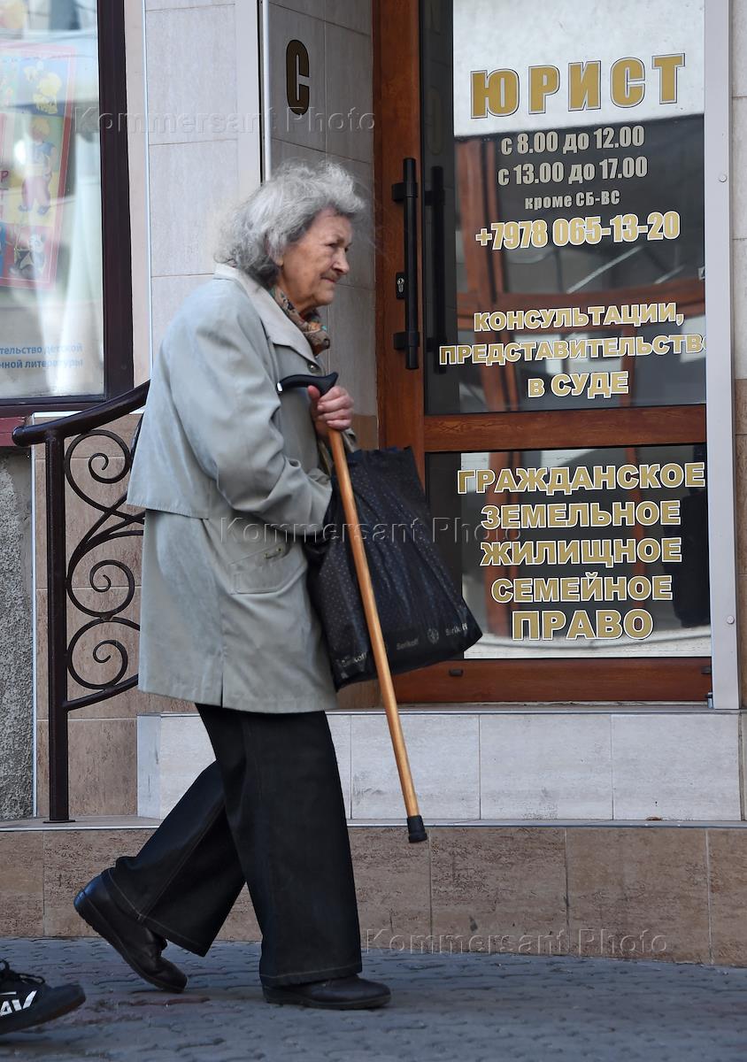 Жанровые фотография. Пожилая женщина у офиса юридической консультации.
