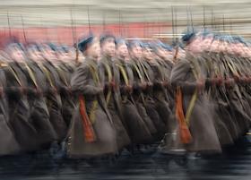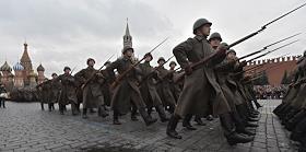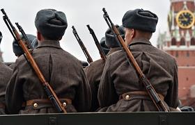 Участники торжественного марша, посвященного легендарному параду 7 ноября 1941 года на Красной…