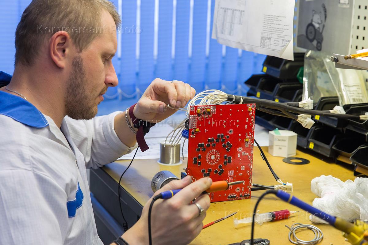 Жанровая фотография. Производство радиэлектроники. Печатная плата. Паяльник.