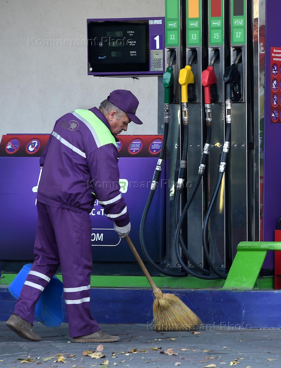 Жанровая фотография. Сотрудник автозаправочной станции (АЗС) во время уборки территории АЗС.