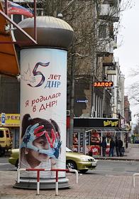 Виды Донецка. Жанровая фотография. Плакат на афишной тумбе "5 лет ДНР. Я родилась в ДНР".