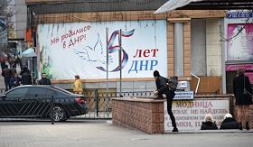 Виды Донецка. Жанровая фотография. Плакат на здании "5 лет ДНР. Мы родились в ДНР".