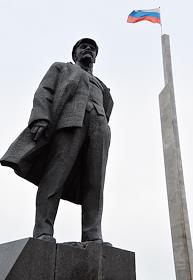 Виды Донецка. Памятник вождю революции Владимиру Ленину в центре города. Государственный флаг России.