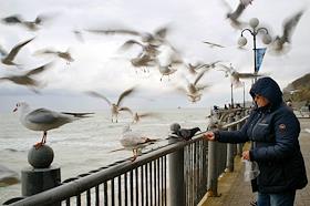 Виды Калининградской области. Жанровая фотография. Женщина кормит на набережной чаек.