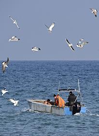 Жанровая фотография. Чайки вьются возле рыбаков, находящихся в лодке.