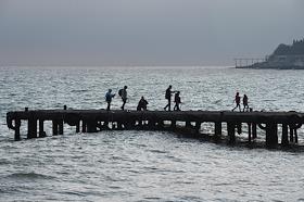 Жанровая фотография. Отдыхающие на пляже. Надпись на стене "С волнореза не прыгать".