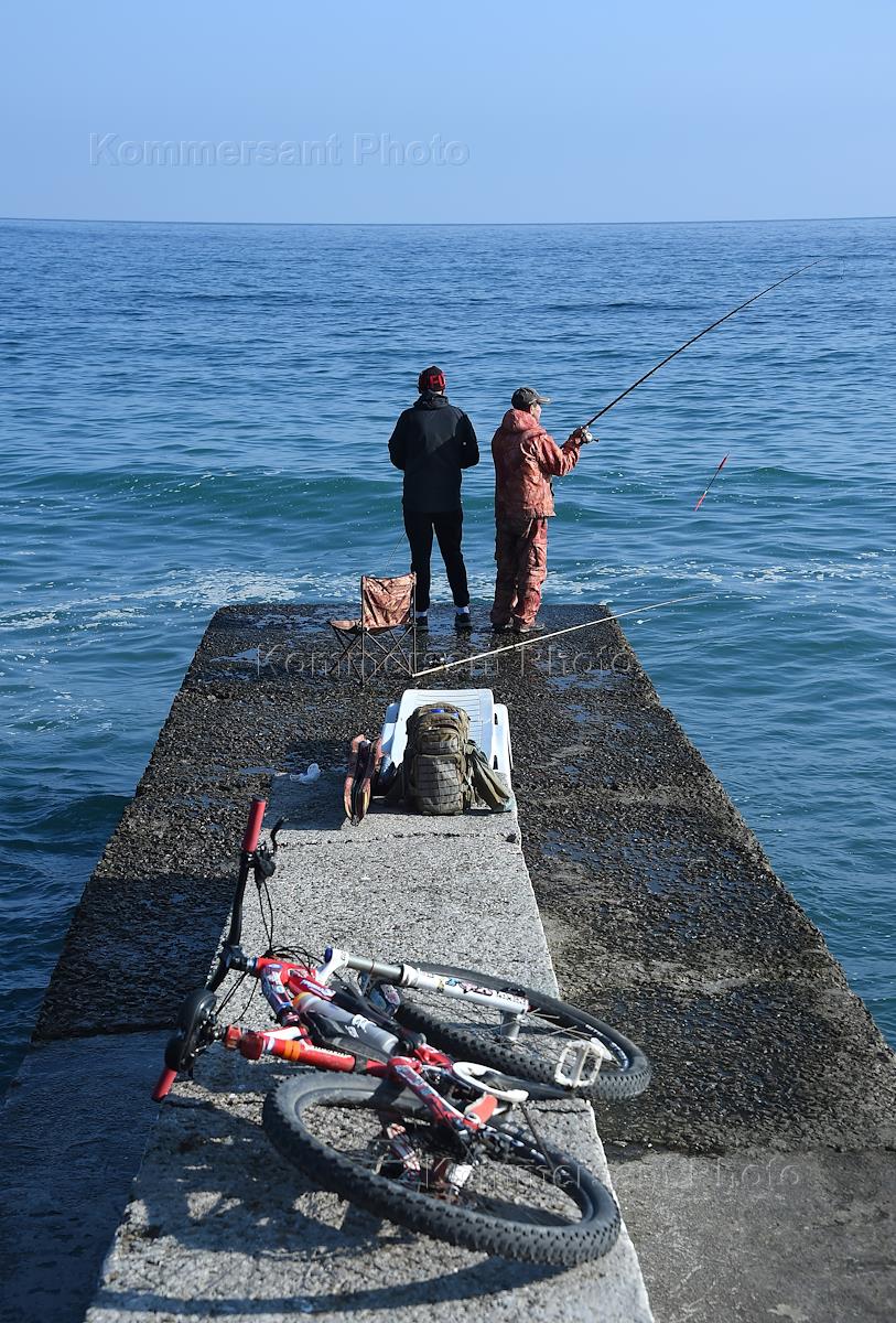 Жанровая фотография. Отдыхающие в одежде на осеннем пляже.