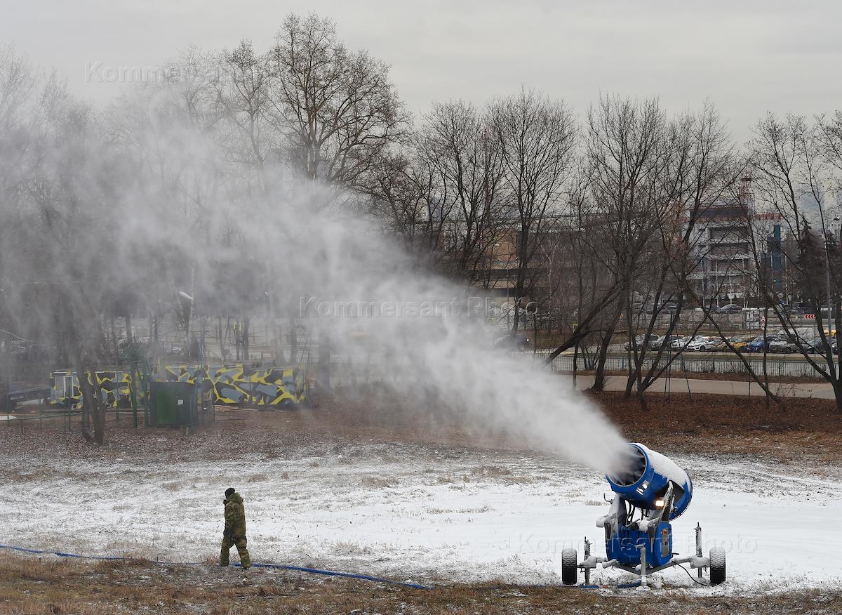 Виды Москы. Жанровая фотография. Снеговые пушки на горнолыжном склоне в парке Крылатские холмы.