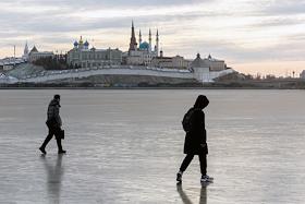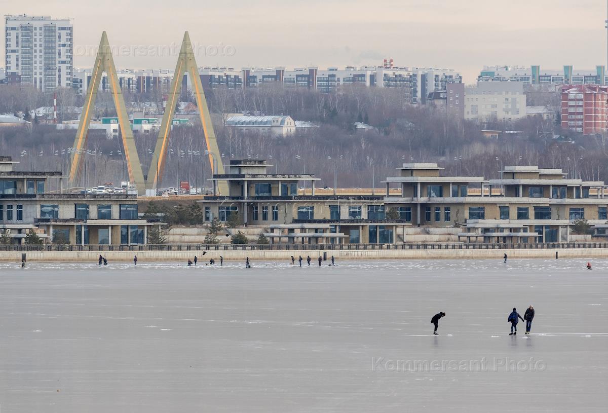 Виды Казани. Жанровая фотография. Люди гуляют по заледеневшей реке Казанка.