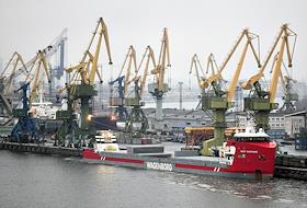 Сухогруз "Михаил Дудин" с радиоактивными отходами из Германии на борту в порту "Санкт-Петербург" во время подготовки к разгрузке
