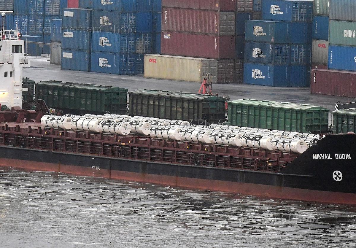 Сухогруз "Михаил Дудин" с радиоактивными отходами из Германии на борту в порту "Санкт-Петербург" во…