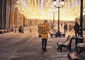 Жанровая фотография. Снегопад в городе. Курьер майта доставки еды "Яндекс Еда" идет по Никольской…