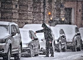 Жанровая фотография. Снегопад в городе. Мужчина очищает от снега припаркованный автомобиль.