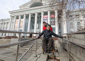 Жанровая фотография. Инвалид-колясочник поднимается по пандусу.