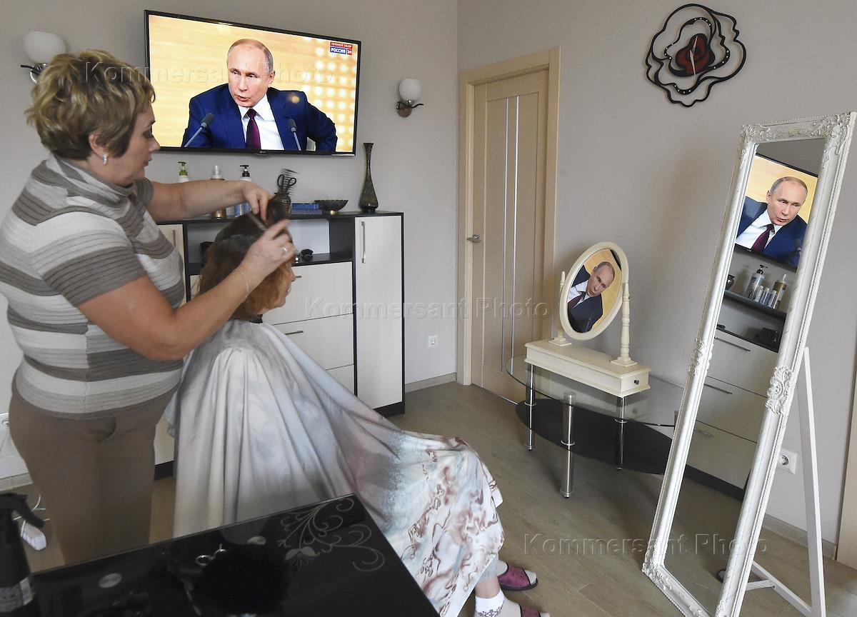 В женском салоне слушают ежегодную пресс-конференцию Владимира Путина—2019.