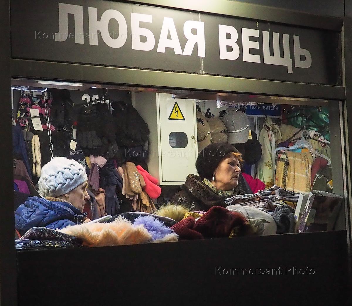 Жанровая фотография. Московский вокзал. Пассажиры Московского вокзала в палатке по продаже одежды…