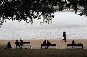Виды Гамбурга. Люди сидят на набережной озера Альстер (Бинненальстер) в центре города.
