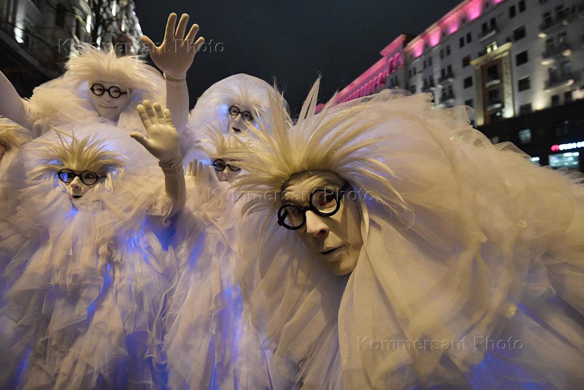 Празднование Нового Года в Москве. Актеры-аниматоры в белых костюмах на Тверской улице.