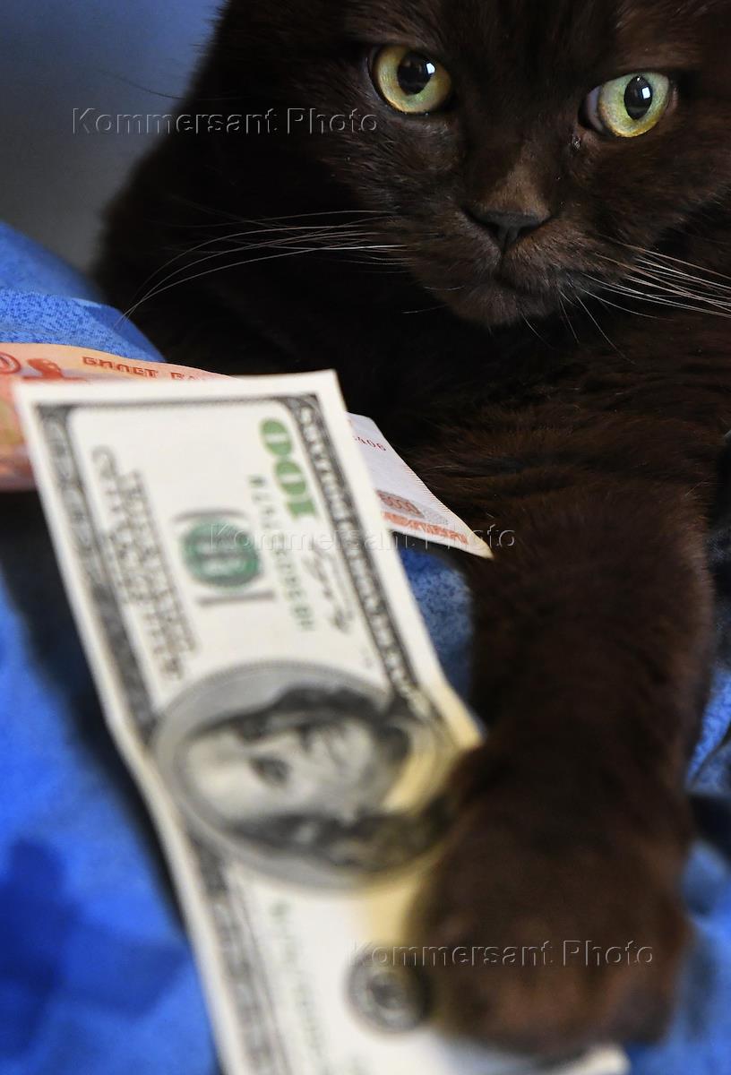 Жанровая фотография. Денежные купюры. Черный кот и купюра в 100 долларов США.