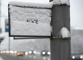 Жанровая фотография. Знак остановки общественного транспорта, засыпанный снегом.
