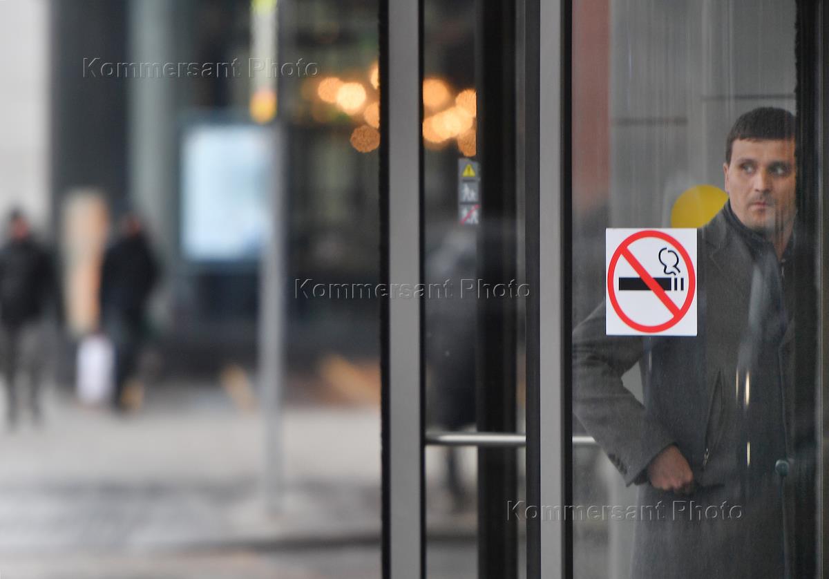 Жанровая фотография. Табличка "Курение запрещено" на стеклянной двери в офисном здании .