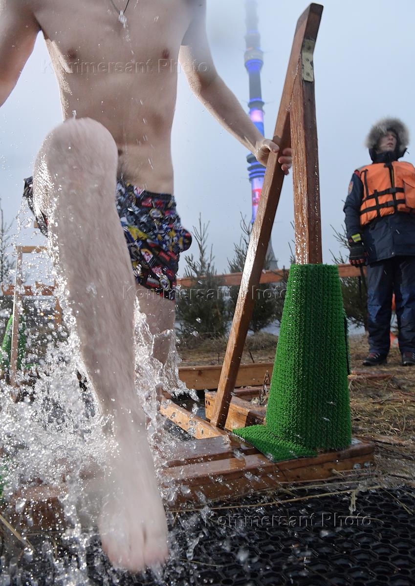 Праздник Крещения Господня. Крещенские купания в Останкинском пруду. Мужчина во время купания…