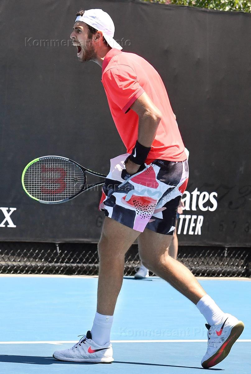 Теннисный турнир Australian Open. День второй. Российский теннисист Карен Хачанов во время матча…