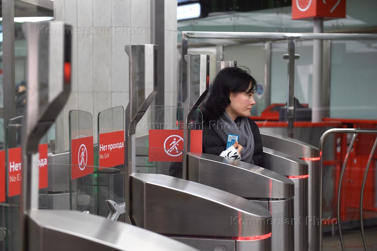 Жанровая фотография. Женщина проходит через турникет на станции метрополитена по карте "Тройка".