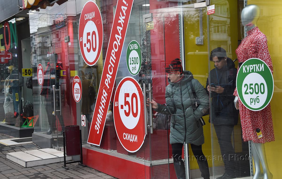 Жанровая фотография. Женщина перед витриной магазина женской одежды с объявлением о полной…