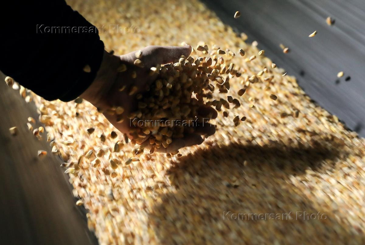 Зерно кукурузы на транспортировочной ленте. Волгоградского элеватора.