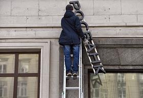 Жанровая фотография. Рабочий во время демонтажа вывески "Росбанка".