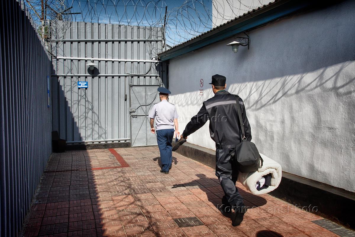 Лечебно-исправительная колония № 1. Осужденный с постельными принадлежностями на территории колонии.