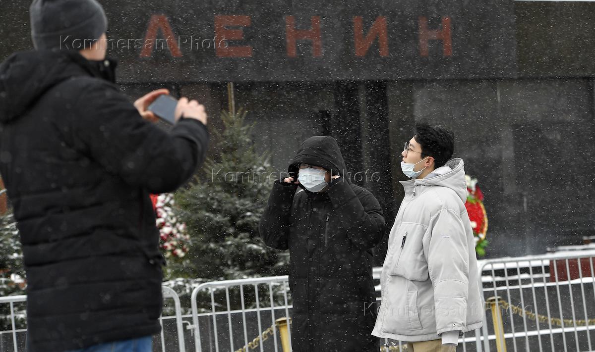 Иностранные туристы из Азии на Красной площади фотографируются у Мавзолея вождя революции Владимира…