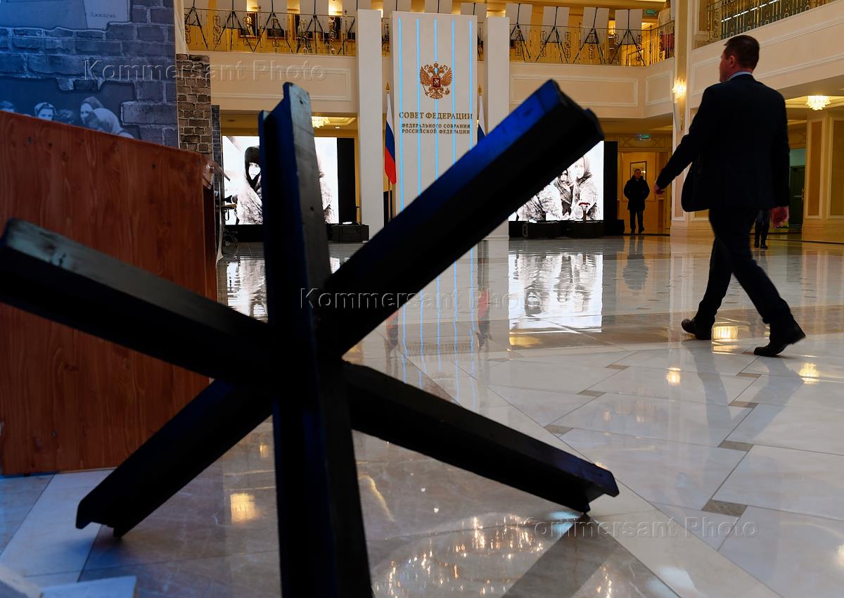 Пленарное заседание Совета Федерации (СФ) России. Жанровая фотография. Противотанковое заграждение -…