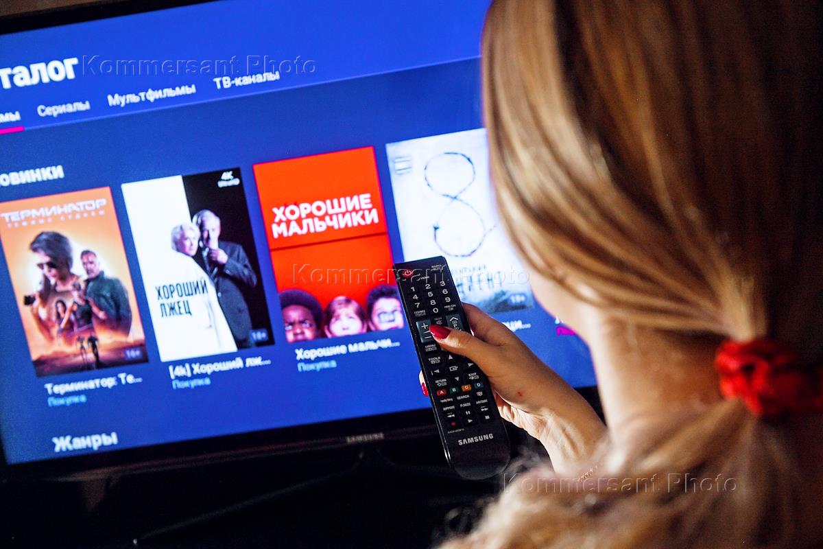 Жанровая фотография. Цифровое телевидение. Онлайн-кинотеатры. Девушка перед экраном телевизора с…