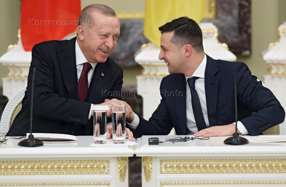 Президент Украины Владимир Зеленский (справа) и президент Турции Реджеп Тайип Эрдоган (слева) во…