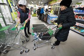 Супермаркет "Моя Виктория" на Кавалергардскя улице, дом 30. Покупательница в овощном отделе.