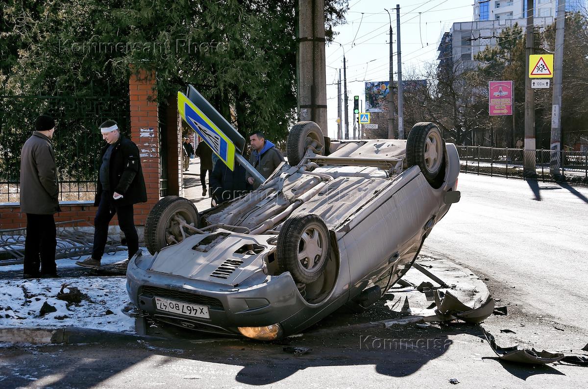 Жанровая фотография. Автомобильная авария. Перевернутый на крышу автомобиль. Сломанные дорожный знак…