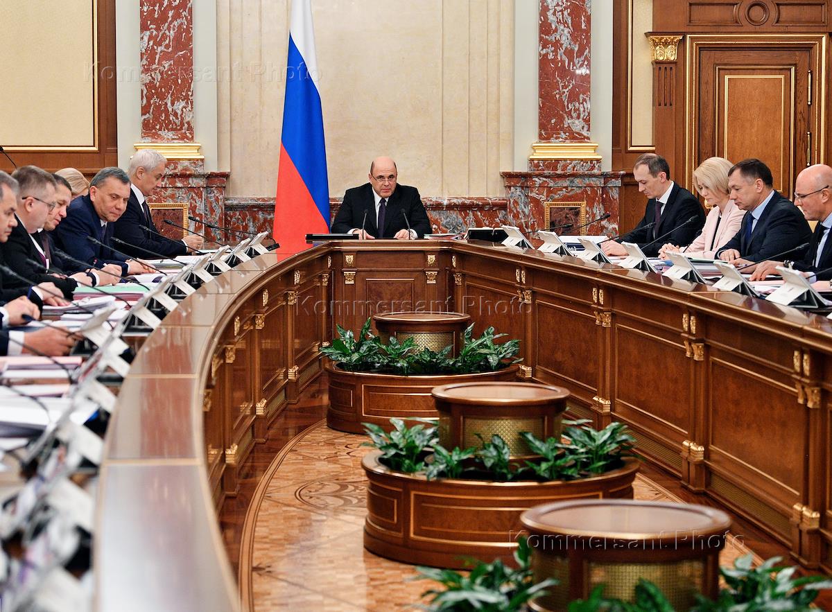 Заседание правительства России. Председатель правительства России Михаил Мишустин (в центре) во…