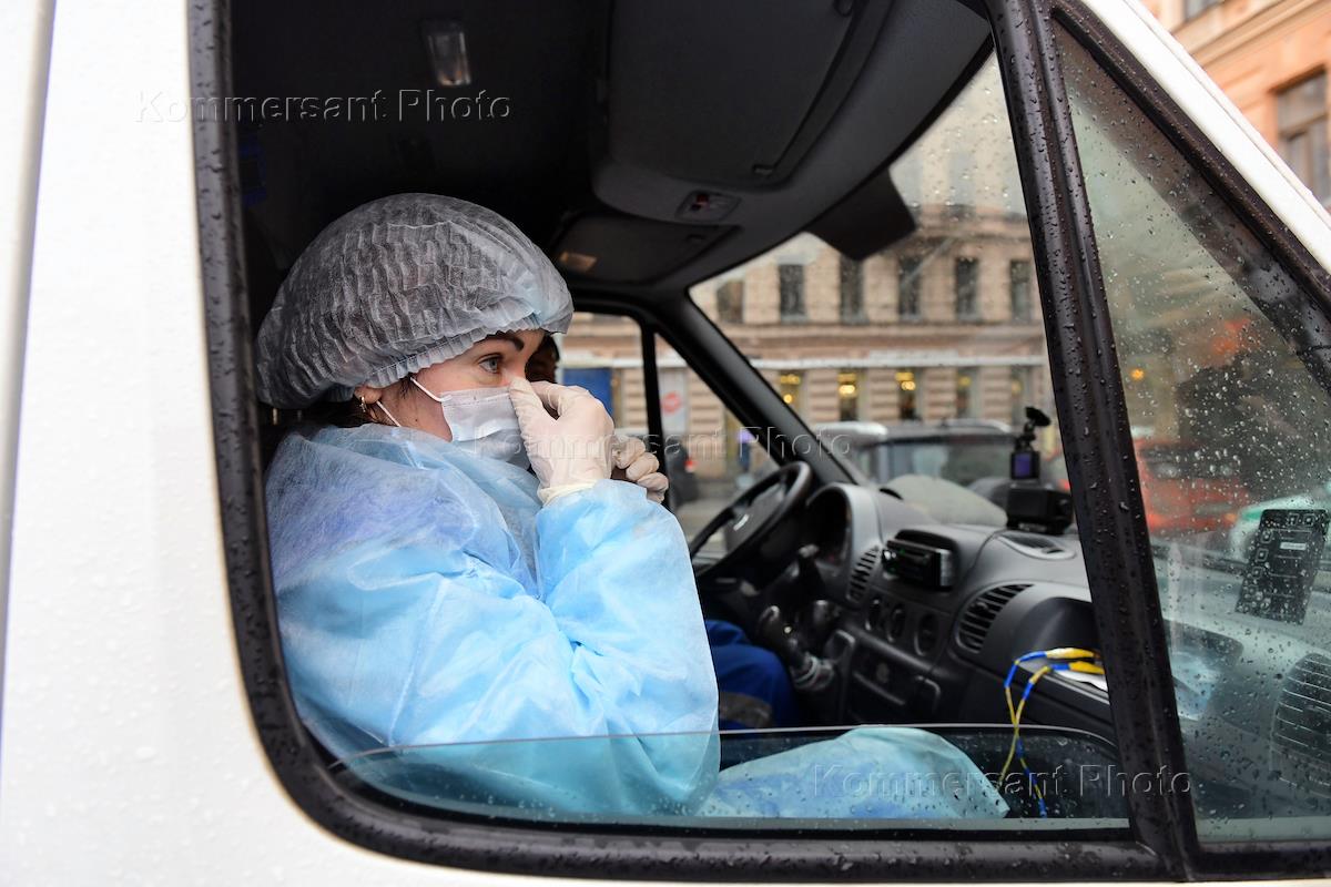 Жанровая фотография. Врач Клинической инфекционной больницы имени С.П.Боткина в машине скорой помощи.