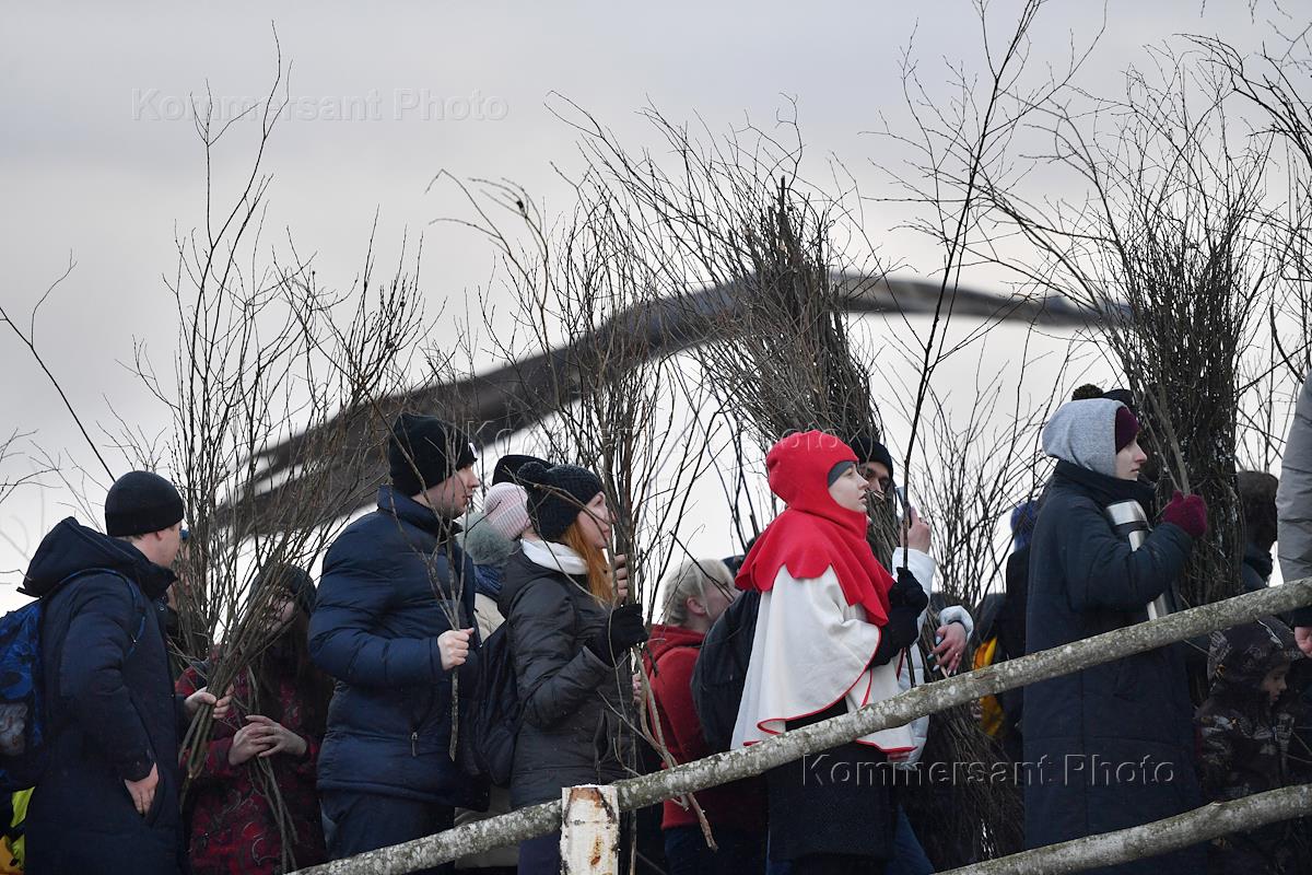 Празднование Масленицы в арт-парке "Никола-Ленивец". Участники во время подготовки сжигания…