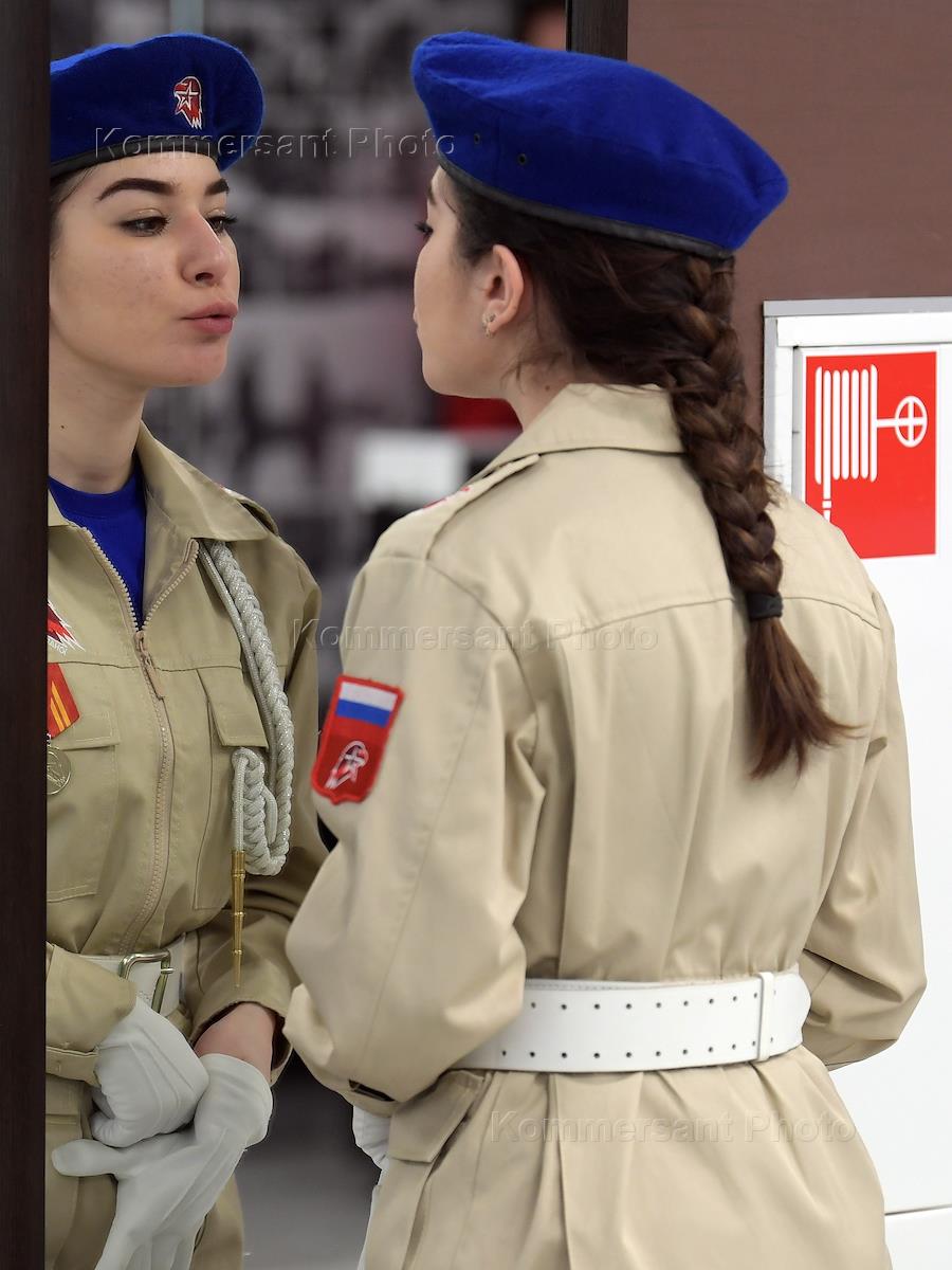 Рабочая поездка президента России Владимира Путина в Псков. Жанровая фотография. Девушка-юнармеец у…