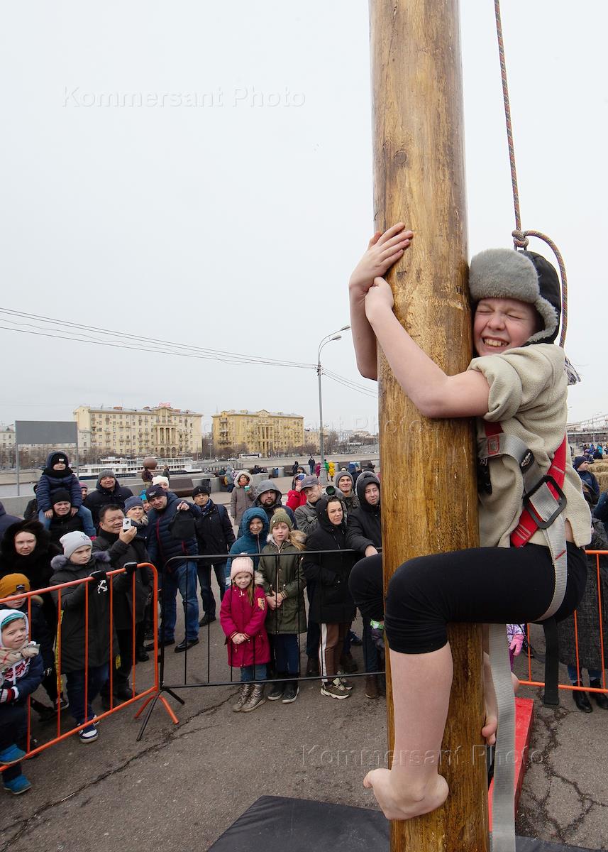 Празднование "Широкой Масленицы" в Парке Горького. Участники праздника во время соревнований по…
