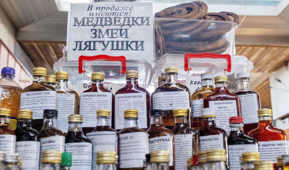 Жанровая фотография. Средства народной медицины на прилавке. Объявление "Медведки, змеи, лягушки".