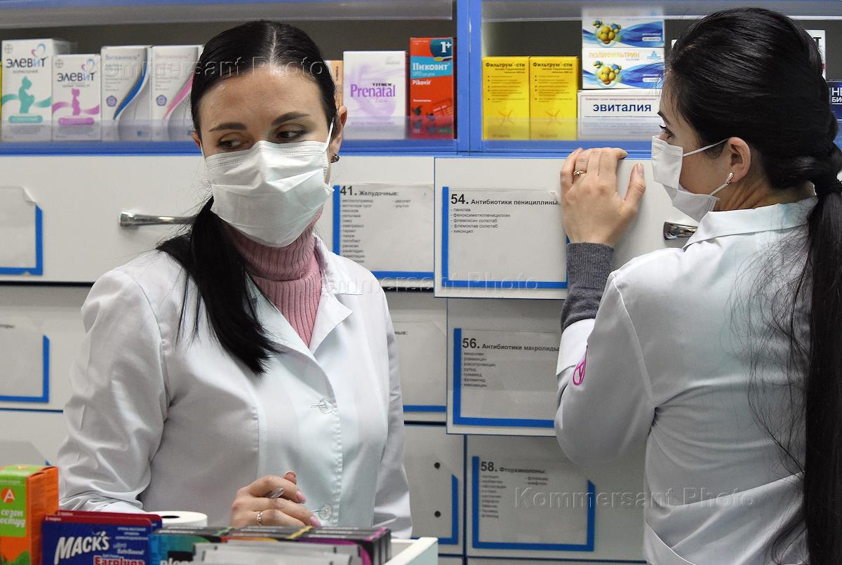 Жанровая фотография. Провизоры аптеки в медицинских масках во время обслуживания покупателей.