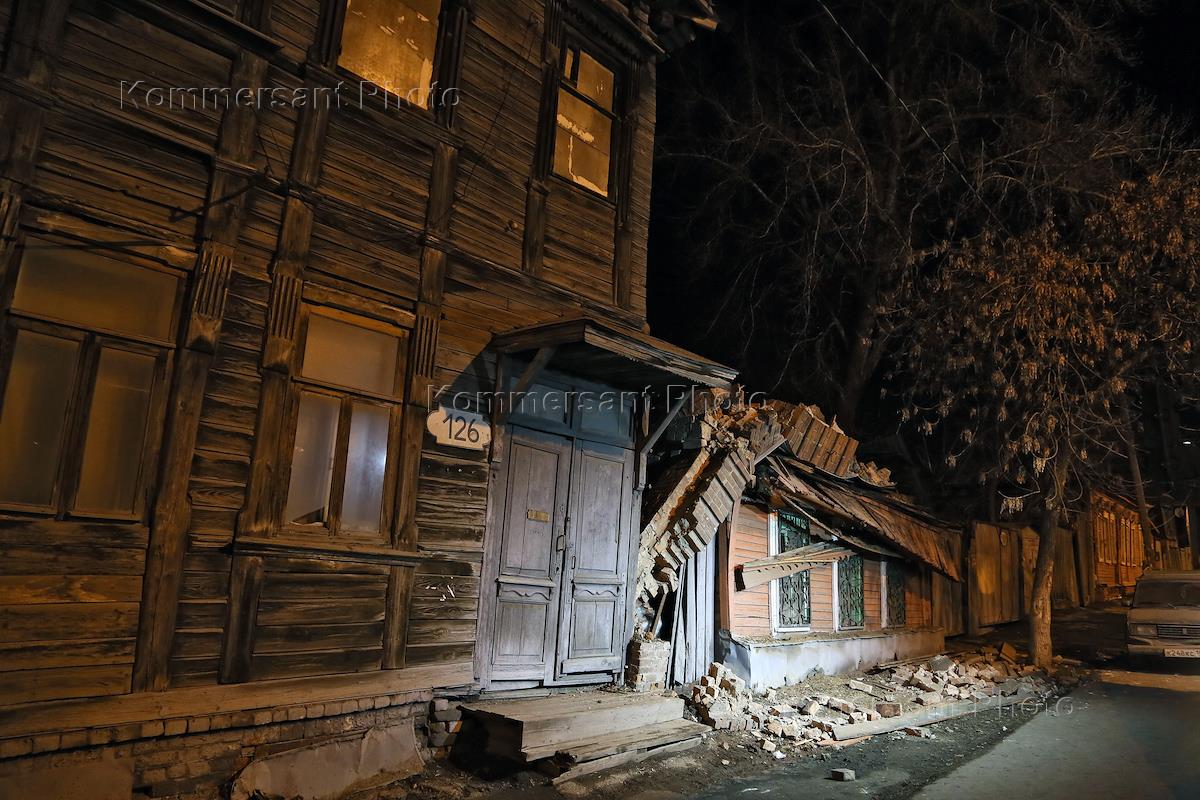 Последствия обрушения стены двухэтажного деревянного жилого дома.